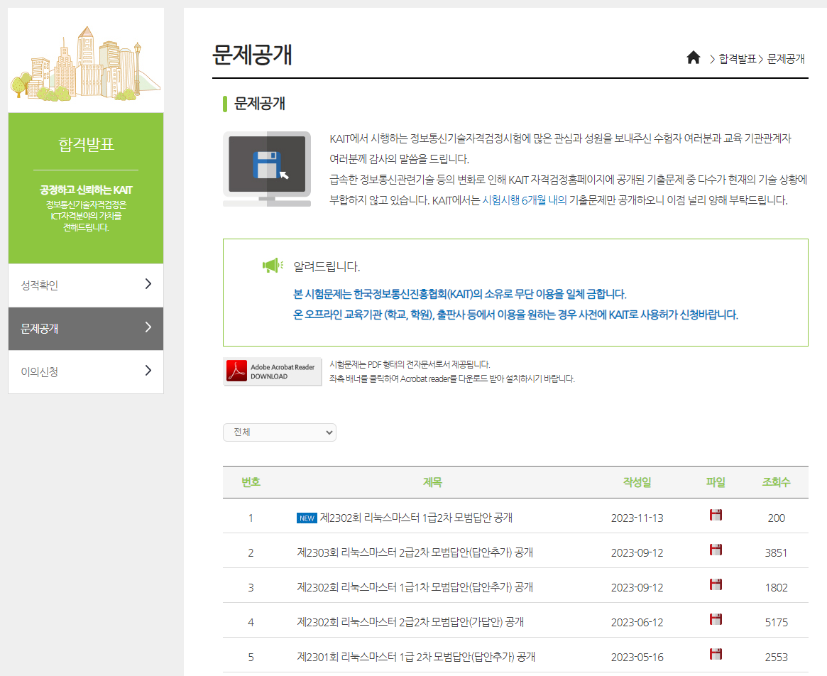 리눅스마스터 1급과 2급 시험문제와 모범답안은 KAIT정보통신기술자격검정 홈페이지에서 시험 시행 6개월 이내의 기출문제만 공개하고 있습니다. 아래 이미지 클릭시 다운로드받을 수 있습니다.