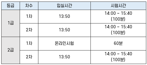 | 등급 | 차수 | 입실시간 | 시험시간 |