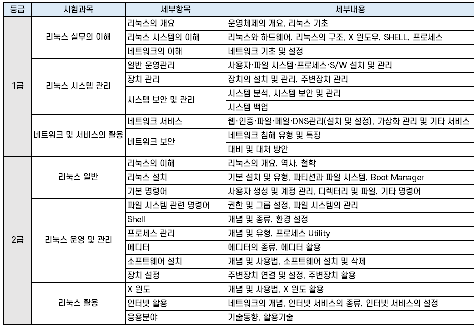 리눅스마스터 1급과 2급 시험과목 및 세부 출제 기준은 다음과 같습니다.