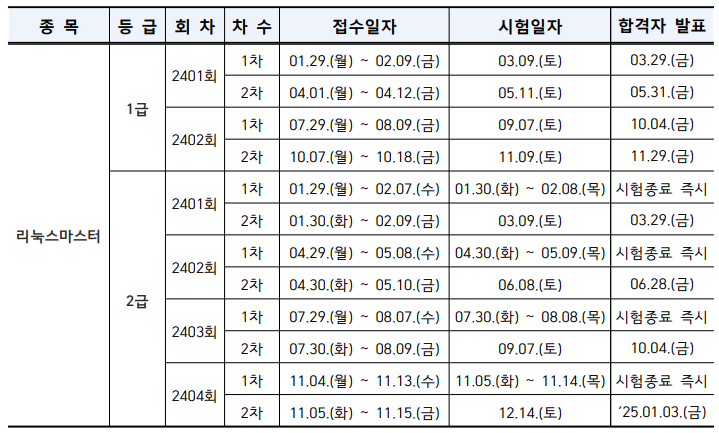 2024년에 시행되는 리눅스마스터 시험날짜, 원서접수기간, 합격자 발표일 등 시험 일정은 다음과 같습니다.
