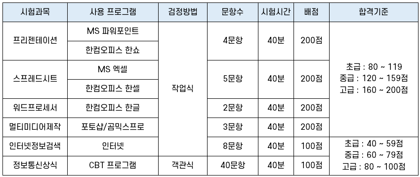 프리젠테이션, 스프레드시트, 워드프로세서, 멀티미디어 제작 과목은 200점 만점 중에서 80점 이상 득점하면 초급, 120점 이상 득점하면 중급, 160점 이상 득점하면 고급 자격을 취득할 수 있습니다.