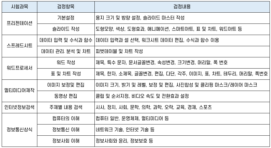 디지털정보활용능력 시험 과목별 출제 내용은 아래 표와 같은데요. 자세한 출제기준은 첨부파일을 확인하세요.