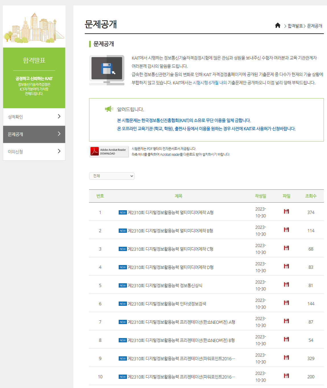 디지털정보활용능력시험 시험 문제는 KAIT정보통신기술자격검정 홈페이지에서 시험 시행 6개월 이내의 기출문제만 공개하고 있습니다. 아래 이미지 클릭시 다운로드받을 수 있습니다.