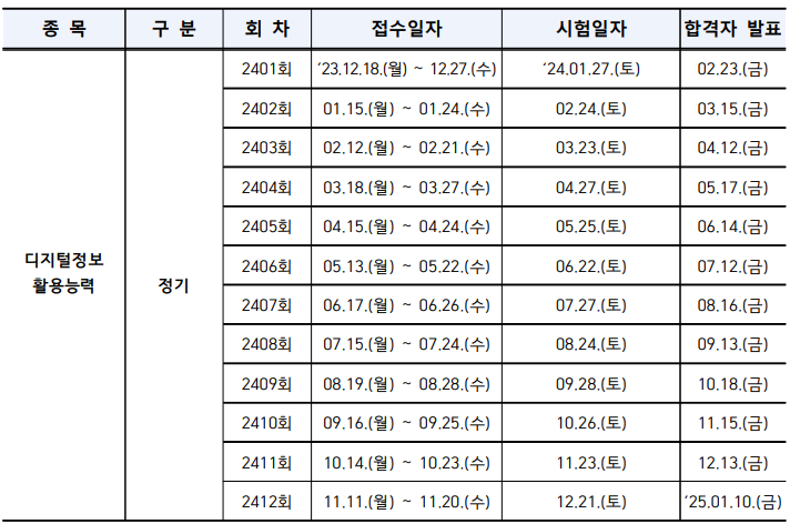 2024년에 시행되는 디지털정보활용능력(DIAT) 시험 날짜, 원서접수기간, 합격자 발표일 등 시험 일정은 다음과 같습니다.