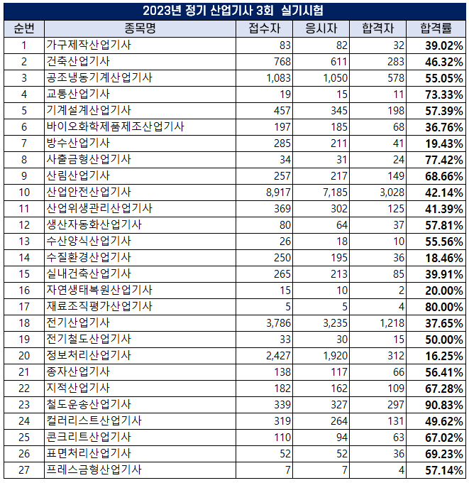 2023년 3회 정기 실기시험에서는 산업안전산업기사를 비롯해 총 27개 산업기사 자격증 종목의 시험이 시행되었고, 채점 결과 및 종목별 합격률은 아래 표와 같습니다.