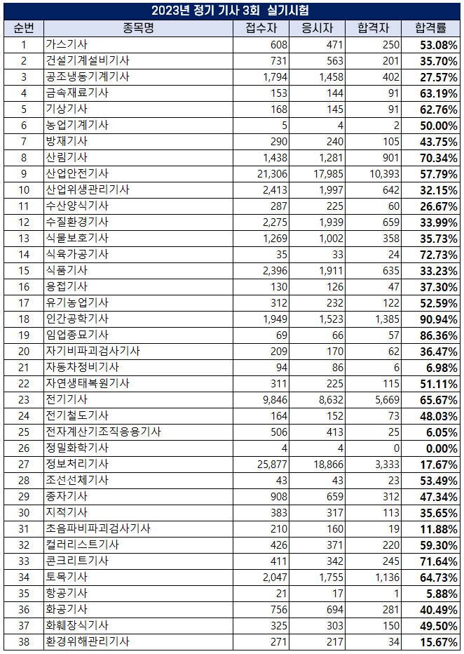 2023년 3회 정기 기사 실기기시험에서는 전기기사를 비롯해 총 38개 기사 자격증 종목의 시험이 시행되었고, 채점 결과 및 종목별 합격률은 아래 표와 같습니다.