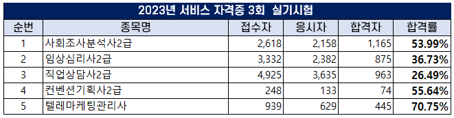 2023년 3회 정기 실기시험에서는 작업상담사 2급을 비롯해 총 5개 서비스 자격증 종목의 시험이 시행되었고, 채점 결과 및 종목별 합격률은 아래 표와 같습니다.