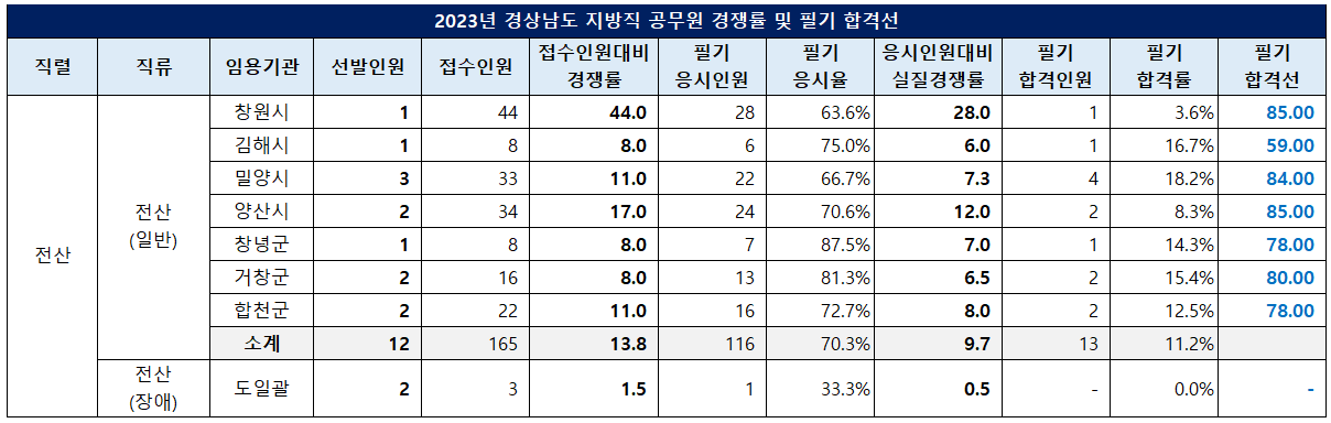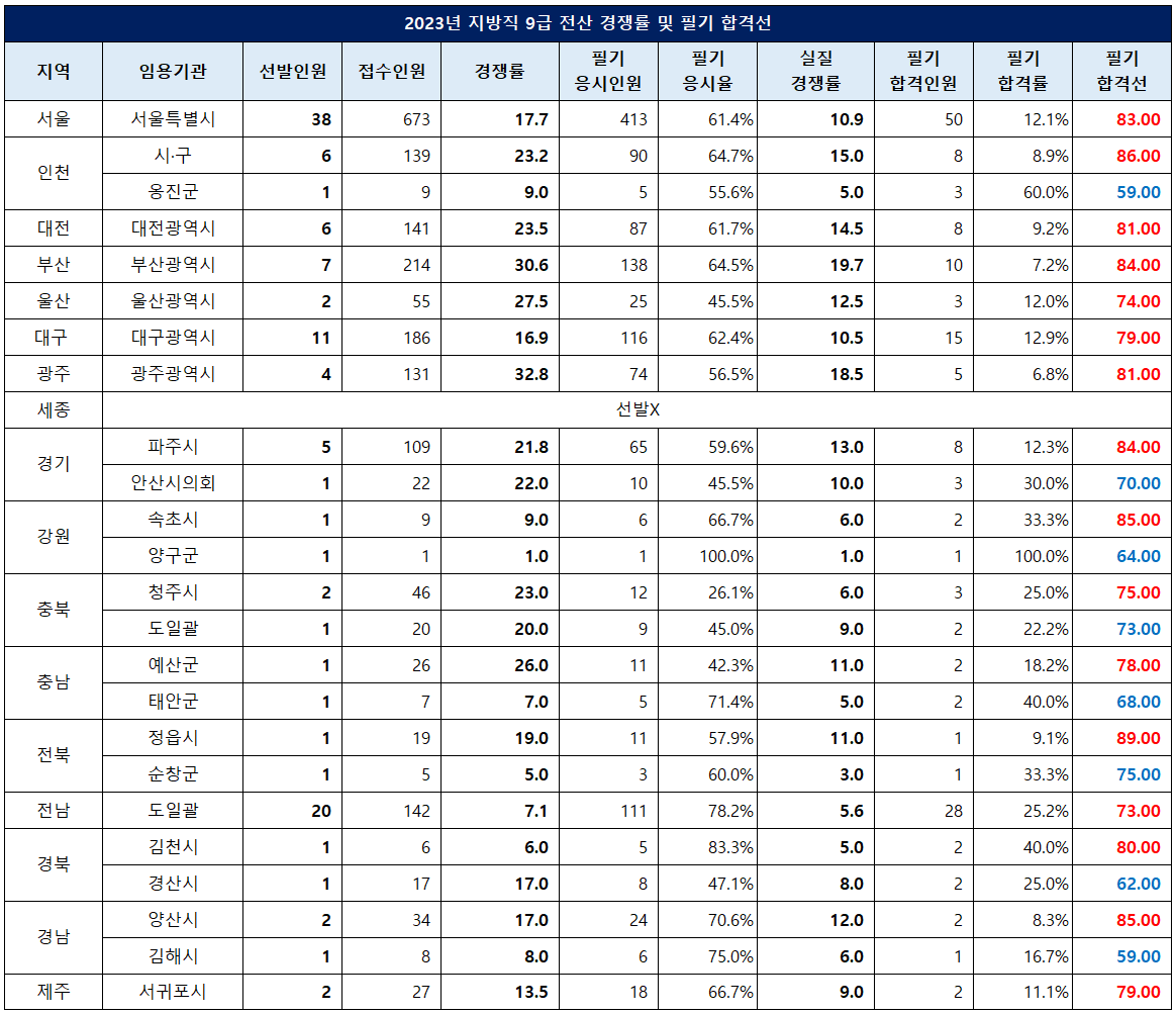 이번 포스팅에서는 2023년 공채시험을 시행한 지역의 9급 지방 전산직 공무원의 선발인원, 원서접수인원, 경쟁률(원서접수인원 대비 경쟁률), 필기시험 응시인원, 응시율, 실질 경쟁률(필기시험 응시인원 대비 경쟁률), 필기시험 합격인원, 합격률, 합격선(커트라인)등에 대해 정리했습니다.