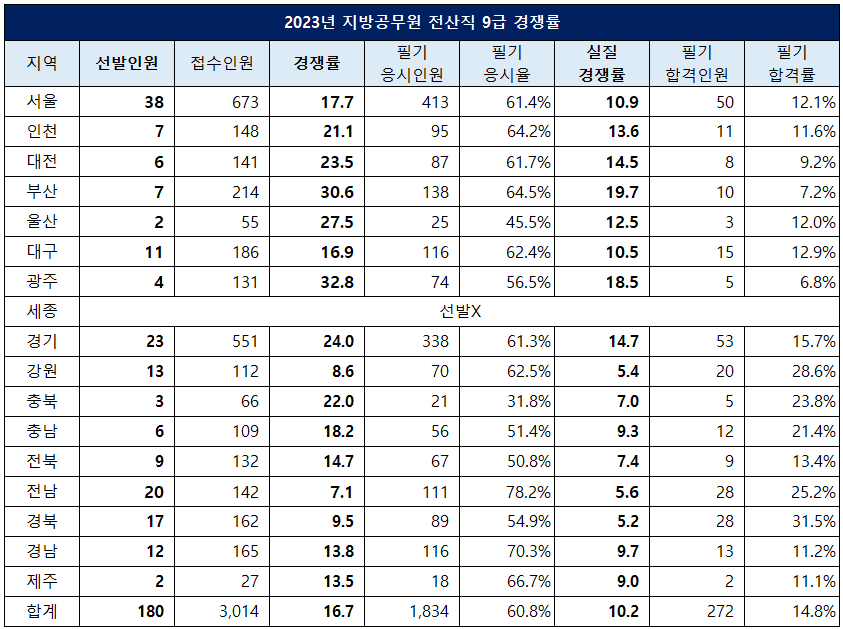 2023년 9급 전산직 공무원은 16개 시도에서 180명을 선발하는데 3,014명이 원서접수를 해 16.7대 1의 경쟁률을 기록했고, 필기시험 응시율은 60.8%, 실질 경쟁률은 10.2대 1입니다.