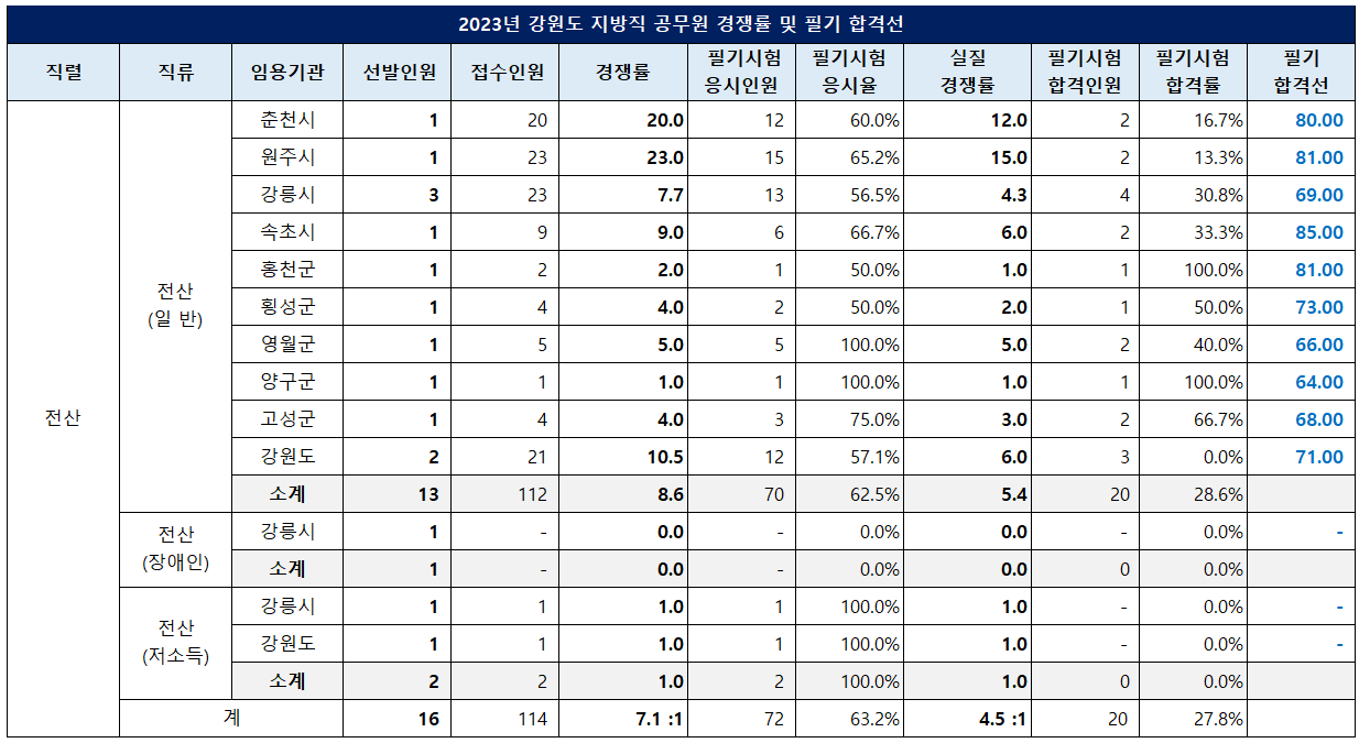 강원 9급 전산직 공무원은 13명을 선발하는데 112명이 지원해 8.6대 1의 경쟁률을 기록했고, 필기시험 응시율은 62.5%, 실질 경쟁률은 5.4대 1이었습니다.