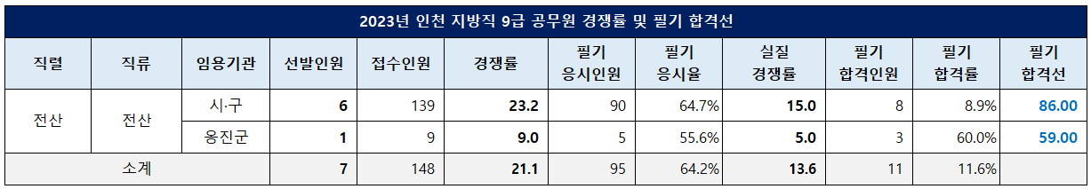 인천시 9급 전산직 공무원은 일반모집으로 총 7명을 선발하는데 148명이 지원해 21.1대 1의 평균 경쟁률을 기록했고, 필기시험 응시율은 64.2%, 실질 경쟁률은 13.6대 1이었습니다.
