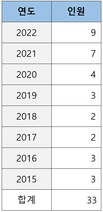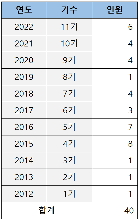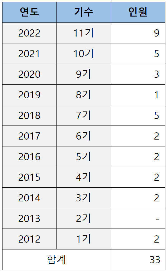 로스쿨 출신이 처음 검사로 임용되기 시작한 2012년(로스쿨 1기)부터 2022년(로스쿨 11기)까지 11년간 이화여대 로스쿨이 배출한 검사는 아래 표와 같습니다.
