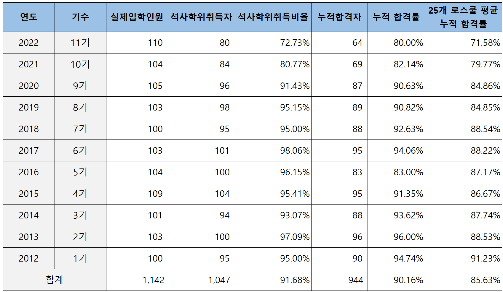 2012년 제1회부터 2022년 제11회까지 이화여대 로스쿨의 누적 석사학위 취득자 현황 및 변호사 시험 합격률은 아래 표와 같습니다.