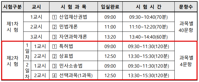 7월 26일과 27일 이틀 동안 시행되는 2024년 변리사 2차 시험은 주관식 논술형으로 아래 시간표에 따라 시행됩니다.