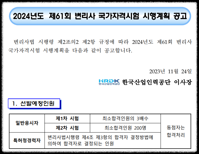 오늘(2023년 11월 24일) 2024년에 시행되는 제61회 변리사 자격 시험 일정 및 시행계획이 공고되었습니다(시행계획 공고 파일 하단 첨부).