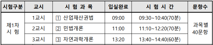 2024년 2월 24일에 시행되는 변리사 1차 시험은 오전 9시 30분부터 오후 2시 40분까지 아래 시험 시간표에 따라 3교시로 구분해 시행됩니다.