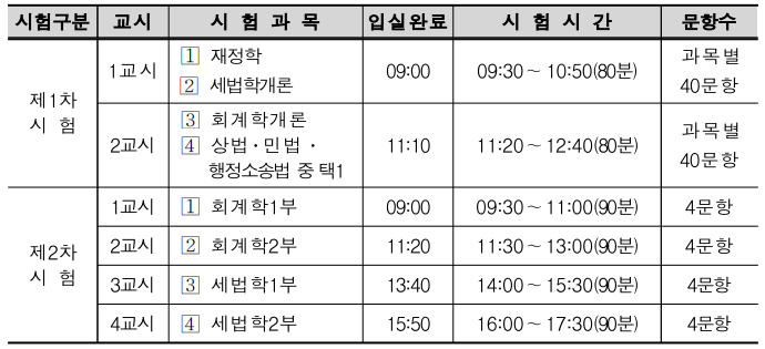 1교시 | 재정학, 세법학개론 | 09:00 | 09:30~ 10:50(80분) |