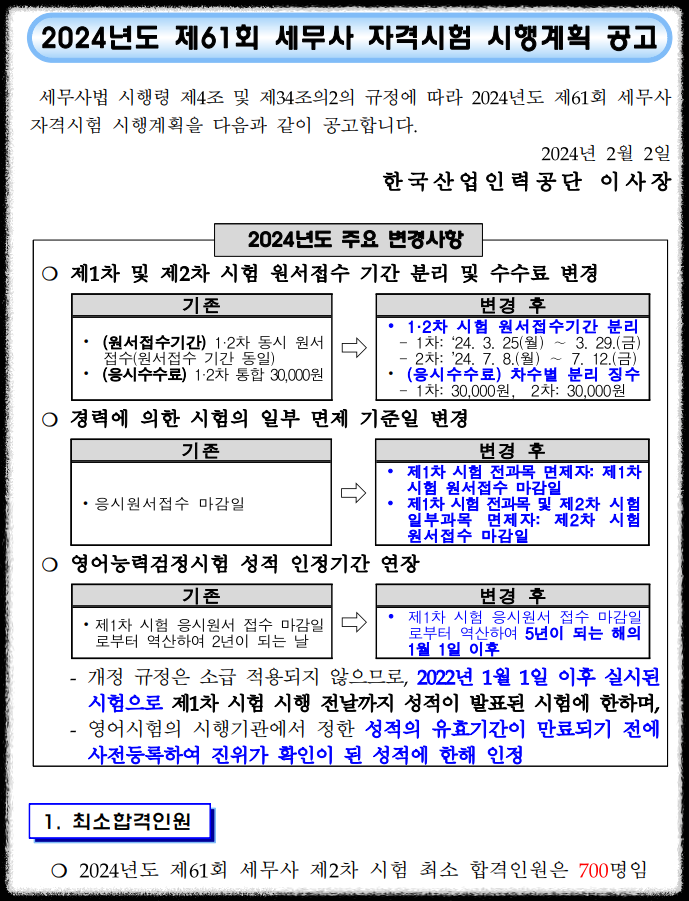 2024년 제61회 세무사 자격시험 시행공고에 따르면 2024년도에도 지난해와 마찬가지로 2차 시험 최소 합격인원은 700명입니다(시행공고 파일 하단 첨부).