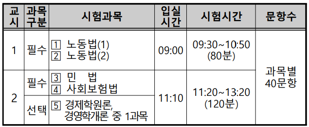 | 2교시 | 11:20 ~ 13:20 (120분) | 민법, 사회보험법, 선택과목(경제학원론, 경영학개론 중 1과목) |