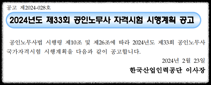 공인노무사 자격시험을 시행하는 한국산업인력공단이 오늘(2023년 11월 24일) 2024년 노무사 시험 일정을 공고했습니다.