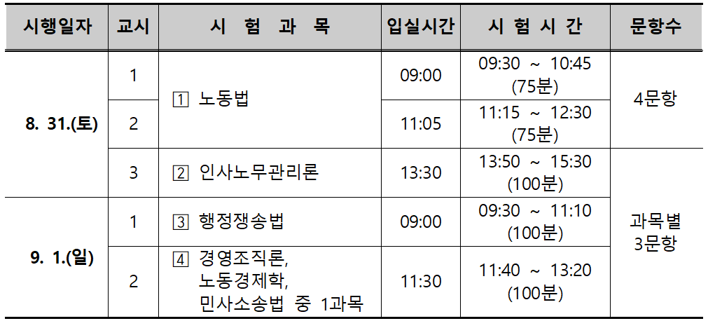 | 8. 31.(토) | 1 | 노동법 | 09:30 ~ 10:45 (75분) |