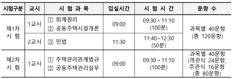 1교시 | 주택관리관계법규, 공동주택관리실무 | 09:30~11:10 (100분) |