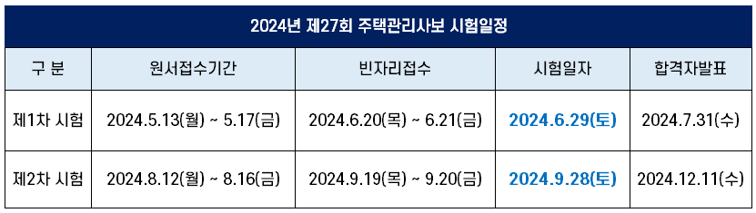 주택관리사 자격시험을 시행하는 한국산업인력공단(큐넷 Q-Net)이 2024년 주택관리사 시험 일정을 발표했습니다.