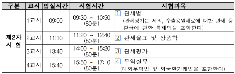 | 1교시 | 09:30 ~ 10:50 (80분) | 관세법 |