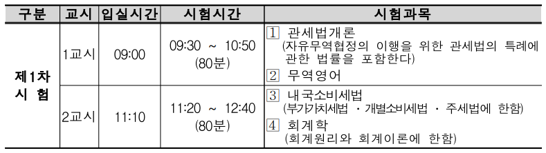 | 1교시 | 09:30 ~ 10:50 (80분) | 관세법개론, 무역영어 |