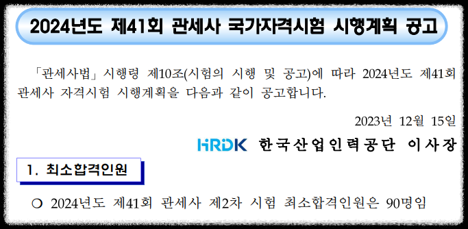 관세사는 2024년에 제41회 시험을 시행하는데요. 지난해와 마찬가지로 2024년에도 2차 시험 최소 합격인원은 90명입니다(시행계획 공고 파일 하단 첨부).