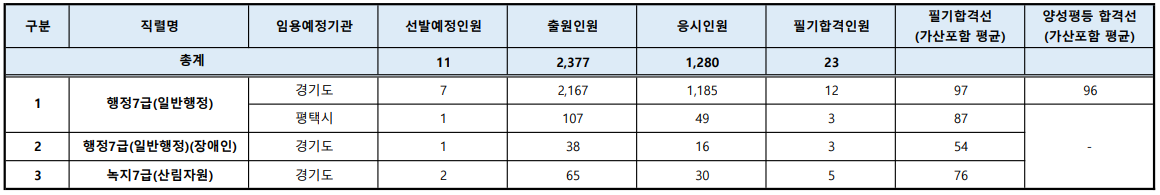 평택시가 임용하는 7급 일반행적직은 107.0대 1의 경쟁률을 보였고, 필기 합격선은 87.00점이었습니다.