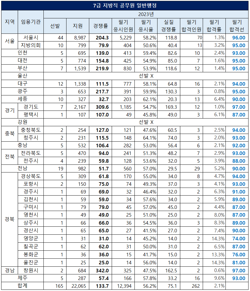 | 2023년 서울시 지방직 7급 공무원 경쟁률 및 합격선 (필기 커트라인) (0) | 2023.11.25 |