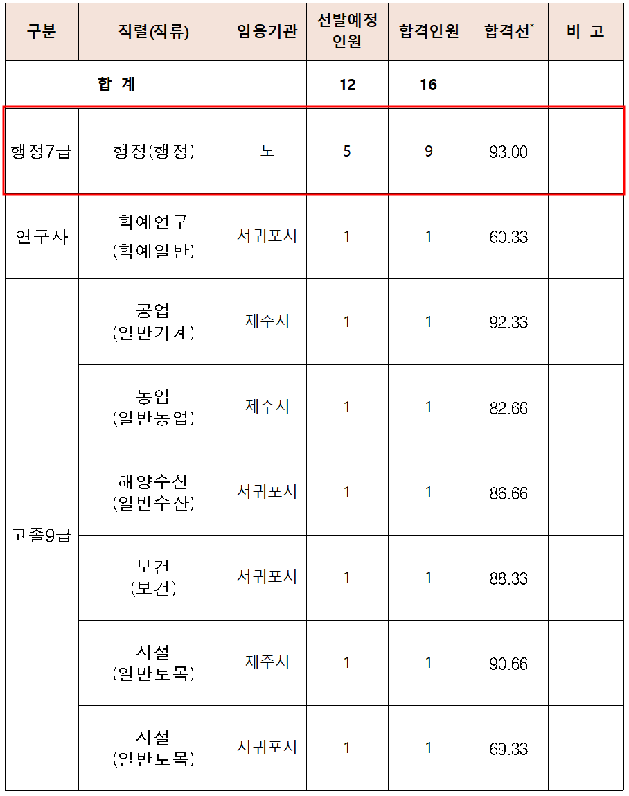 제주도 7급 지방직 경쟁률 및 합격선