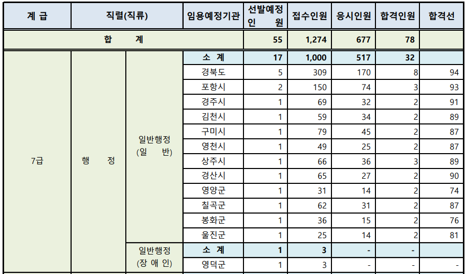 경상북도 7급 지방직 경쟁률 및 합격선