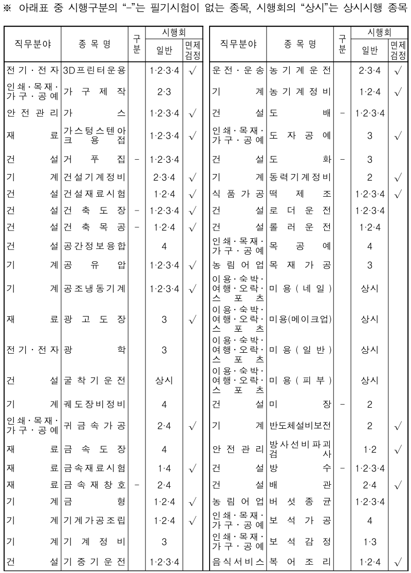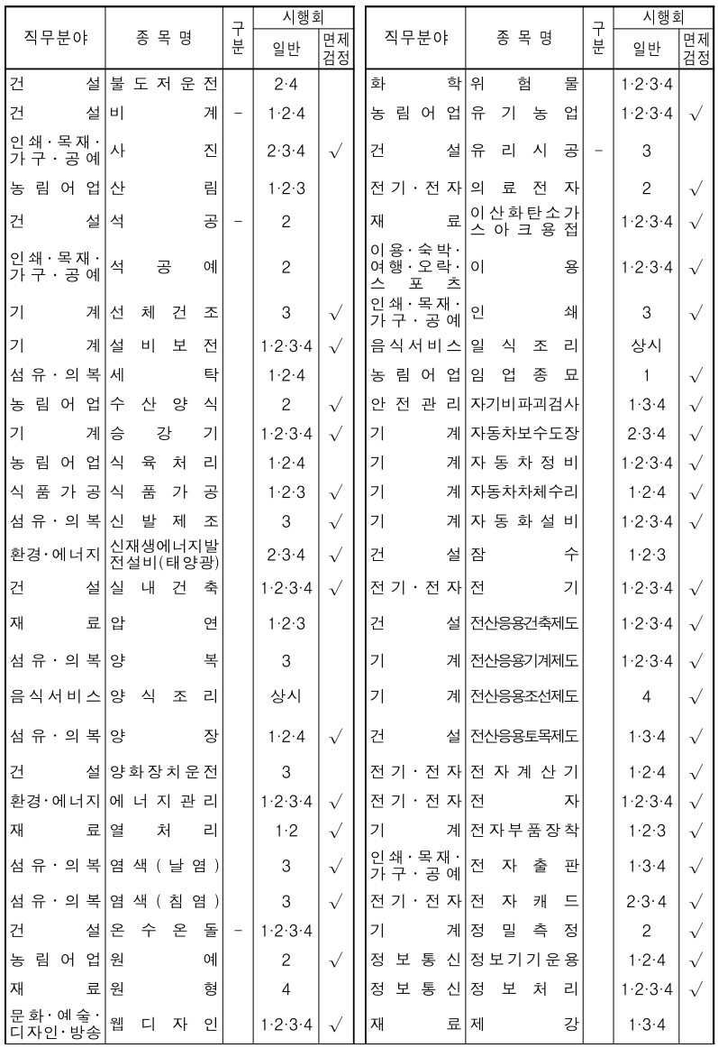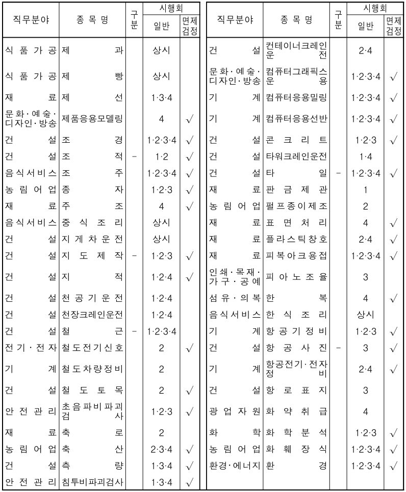 굴착기운전기능사, 미용사(일반), 미용사(피부), 미용사(네일), 미용사(메이크업), 양식조리기능사, 일식조리기능사, 제과기능사, 제빵기능사, 중식조리 기능사, 지게차운전기능사, 한식조리기능사, 건축도장기능사, 방수기능사