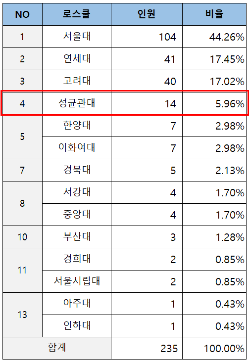 2020년엔 20명의 재판연구원을 배출하기도 한 성균관대 로스쿨은 지난 11년간 총 96명의 로클럭을 배출하여 84명을 배출한 서울대를 제치고 1위를 기록했습니다.