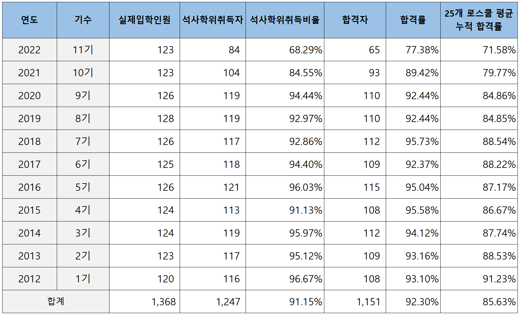 2012년 제1회부터 2022년 제11회까지 성균관대 로스쿨의 누적 석사학위 취득자 현황 및 변호사 시험 합격률은 아래 표와 같습니다.