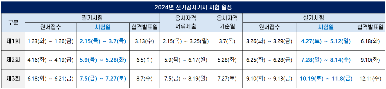 2024년에는 한국산업인력공단이 3회차 시험과 4회차 시험을 통합 시행해 연간 3회만 정기 기사 시험을 시행하기 때문에 전기공사기사는 1회, 2회, 3회차에 필기시험과 실기시험이 실시됩니다.