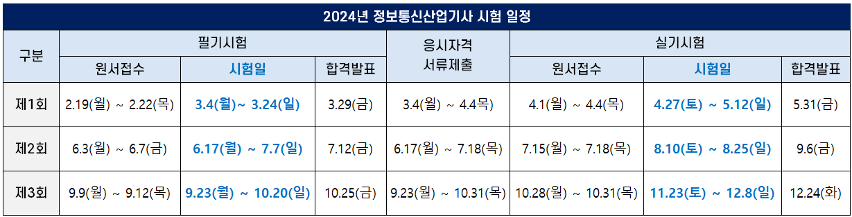 2024년 정보통신산업기사 필기시험 원서접수기간, 시험일, 합격자 발표일, 응시자격서류제출기간 등 시험 일정은 아래 표와 같습니다(모바일 환경에서 표가 깨져 보이는 경우 표 아래 이미지를 보세요).