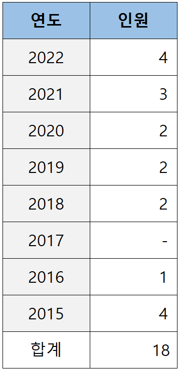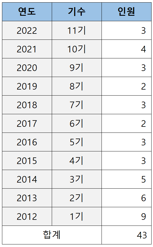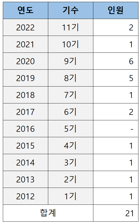 로스쿨 출신이 처음 검사로 임용되기 시작한 2012년(로스쿨 1기)부터 2022년(로스쿨 11기)까지 11년간 경북대 로스쿨이 배출한 검사는 아래 표와 같습니다.