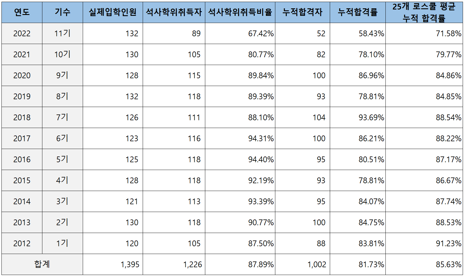 1,226명의 졸업생 중 1,002명이 변호사 시험에 합격하여 석사학위 취득자 대비 변호사 시험 합격률은 81.73%인데요. 25개 로스쿨의 평균 합격률인 85.63%보다 낮습니다.