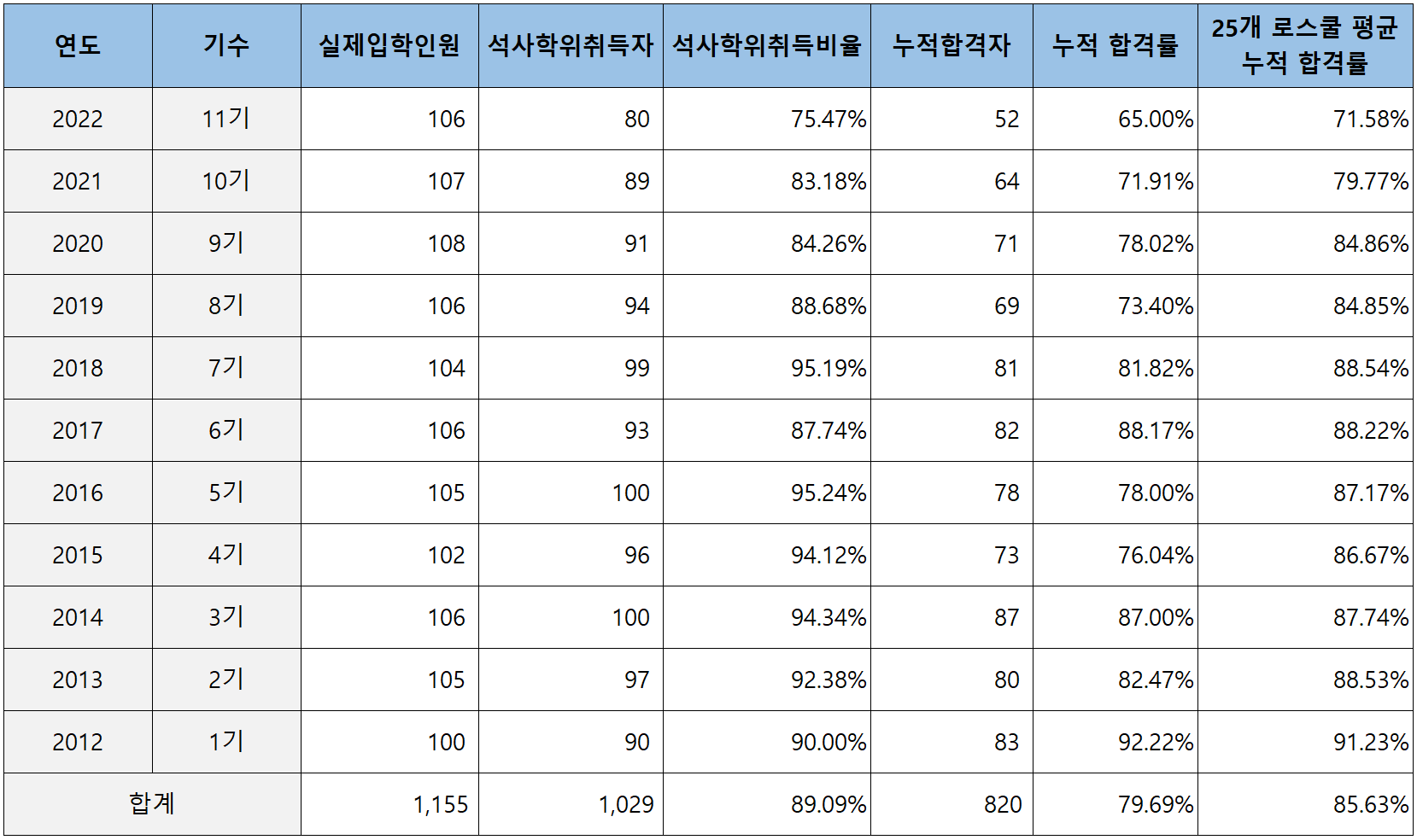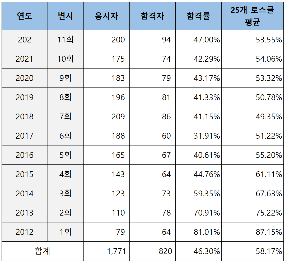 2012년 제1회부터 2022년 제11회까지 충남대 로스쿨의 누적 석사학위 취득자 대비 변호사 시험 합격률은 아래 표와 같습니다.