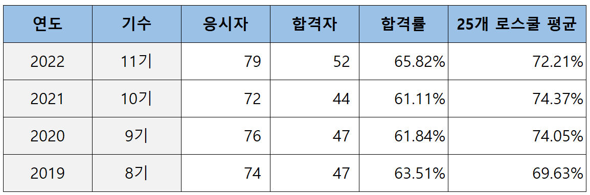 2022년 25개 로스쿨의 변호사 시험 합격률 현황과 순위