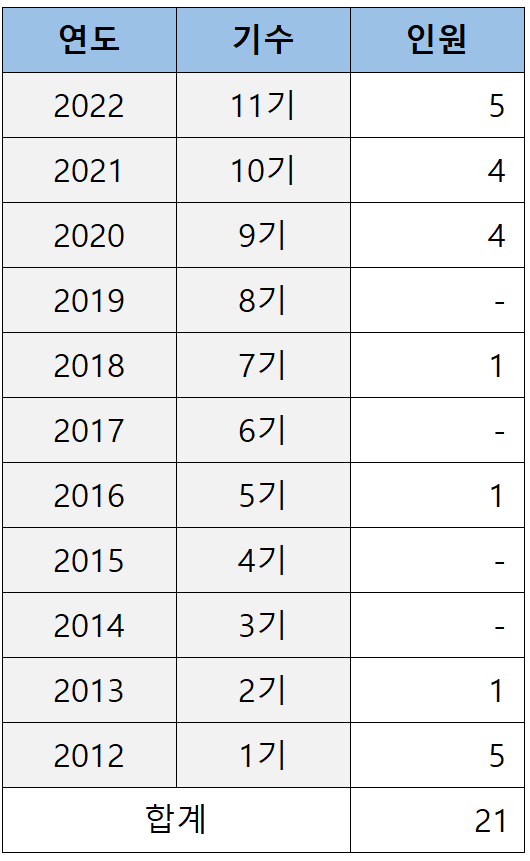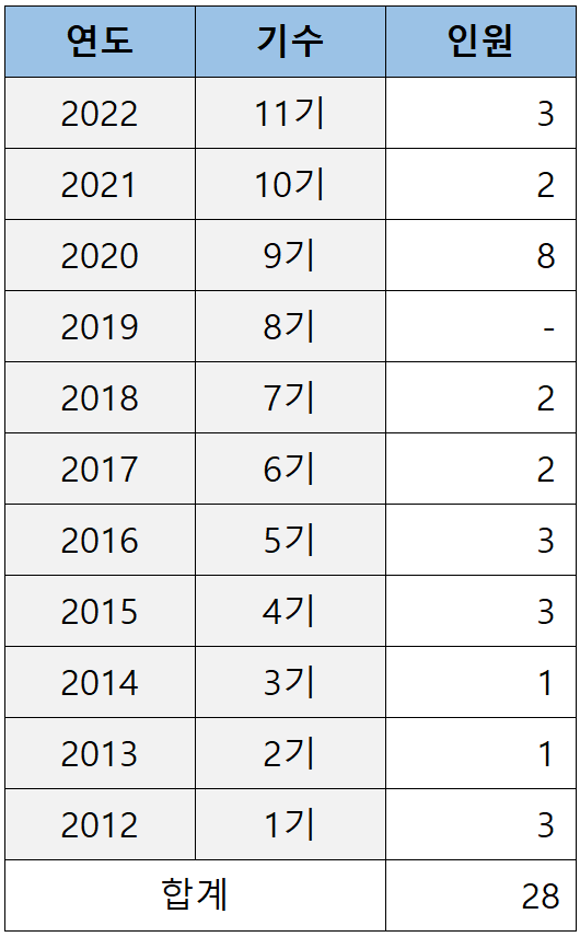 로스쿨 출신이 처음 검사로 임용되기 시작한 2012년(로스쿨 1기)부터 2022년(로스쿨 11기)까지 11년간 충남대 로스쿨이 배출한 검사는 아래 표와 같습니다.