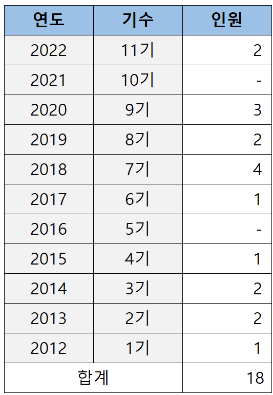로스쿨 출신이 처음 재판연구원으로 임용되기 시작한 2012년부터 2022년까지 11년간 중앙대 로스쿨이 배출한 로클럭은 아래 표와 같습니다.