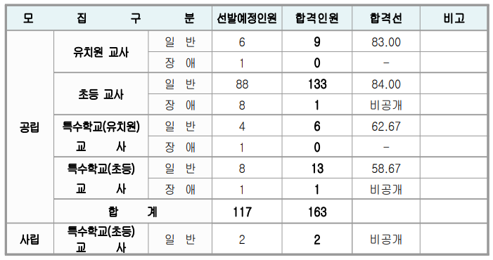 전라북도 교육청에서 선발하는 유치원・초등학교・특수학교(유치원・초등)임용고시 1차 시험 합격자는 공립 113명, 사립 8명입니다.
