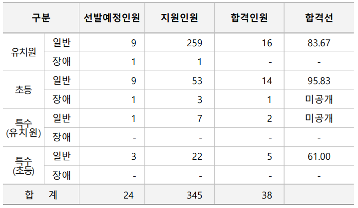 유치원 교사 커트라인은 비공개이고, 초등학교 교사 커트라인은 95.67점, 특수학교(유치원) 교사 커트라인은 73.33점, 특수학교(초등) 교사 커트라인은 60.67점입니다.