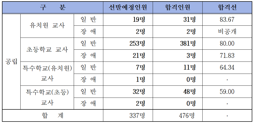 경상북도 교육청에서 선발하는 유치원・초등학교・특수학교(유치원・초등)임용고시 1차 시험 합격자는 공립 476명, 사립 30명입니다.
