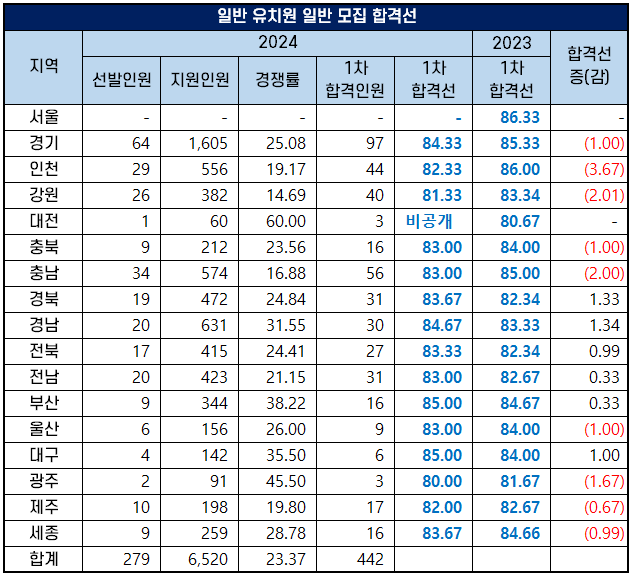 2024년 유치원 임용고시 1차 시험 합격선은 17개 시·도에서 지난해보다 상승했는데요. 부산시와 대구시 유치원 교사 커트라인이 85.00점으로 가장 높았고, 광주시가 80.00점으로 가장 낮았습니다.