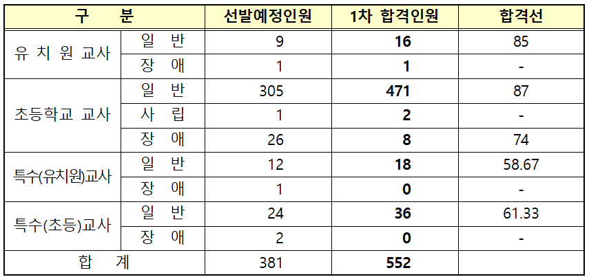 부산광역시 교육청에서 선발하는 유치원・초등학교・특수학교(유치원・초등)임용고시 1차 시험 합격자는 552명입니다.